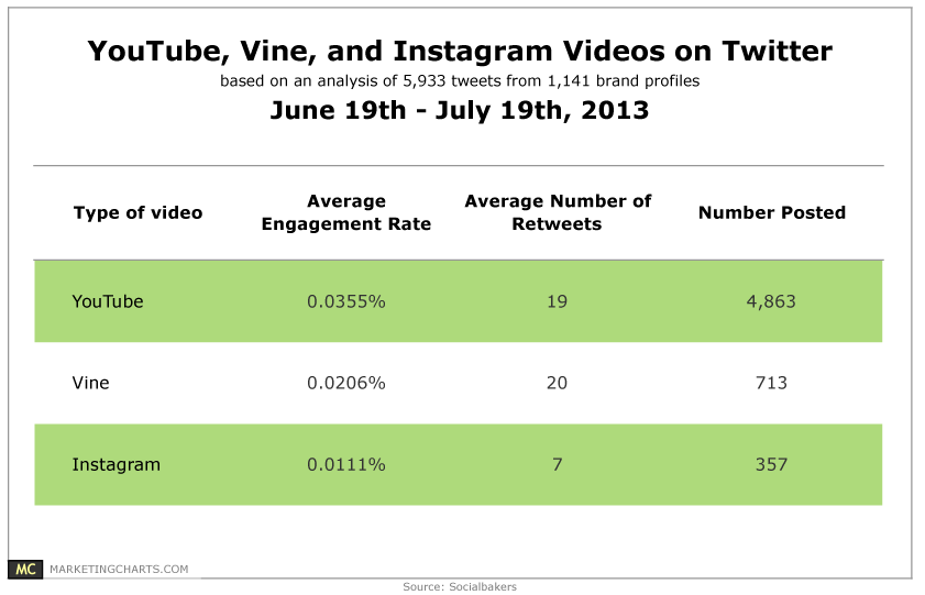 At a glance, during that one-month period, we can see that Vine outperformed Instagram on both engagement rate and number of retweets. Further, according to Unruly’s research in May, 5 Vines get shared every second on Twitter.