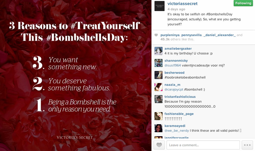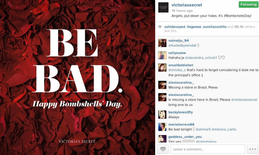 The brand kicked off a month-long rallying call on its social networks around its #bombshellsday hashtag, inviting all women out there to celebrate themselves first and foremost. Its social networks were peppered with feel-good and ego-boosting CTA’s interspersed with lingerie-clad model shots throughout the 4-week period. A YouTube video was created, primarily as a sales tool intended for a male audience. It is the brand’s cheeky one liners on Instagram however that resonated best with me.