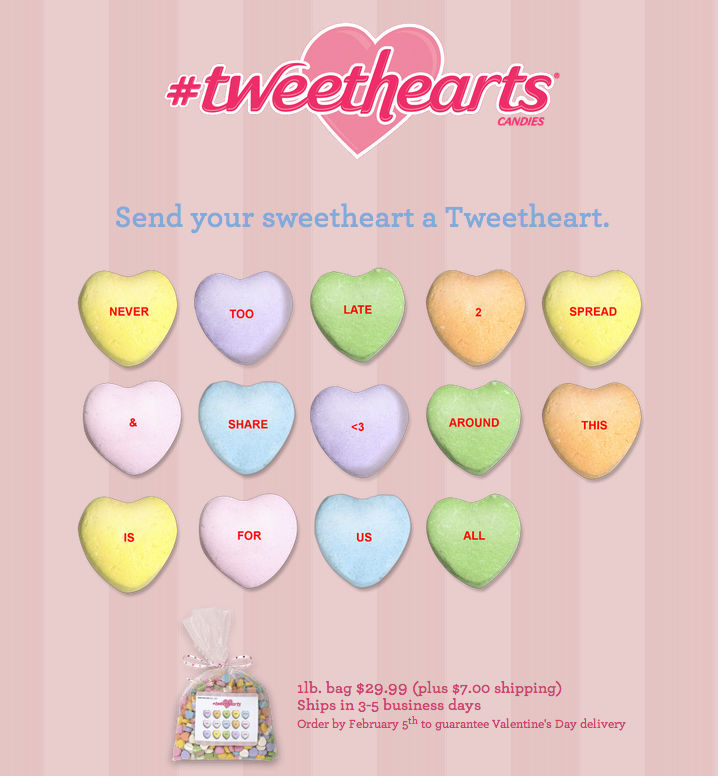 Lastly, the award for “going above and beyond a simple tweet” goes to Necco for its Tweethearts web app and accompanying catchy tune – the app lets you create and order a pack of personalised sweetheart candies from a tweet – see mine below: