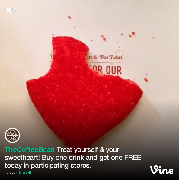 Don’t we all love freebies? A simple human truth that works every time. The Coffee Bean & Tea Leaf company knows this too well as it lured its fans and their special loved ones into its shops with its 2 for 1 promotional offer – as seen on Vine. Perhaps not as original, yet as effective.